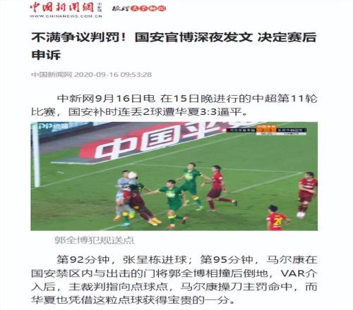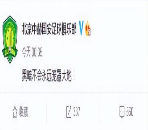 在20年中超第11轮比赛中,北京国安因不服主裁判的判罚,赛后在媒体上发文“黑暗不会永远笼罩大地”的抗议声明。