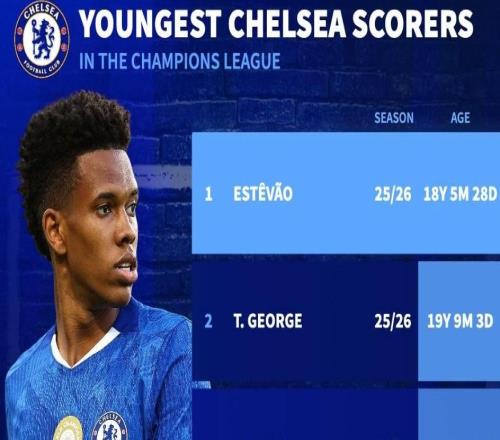 切尔西欧冠最年轻进球者前5:埃斯特旺、乔治、吉乌位居前3位 -
