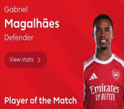 定海神针,加布里埃尔当选阿森纳vs埃弗顿全场最佳球员 -