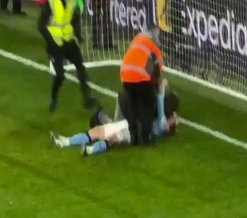 其实我只想安静地躺会儿,在昨日比赛最后时刻哈兰德被一球迷紧抱 -